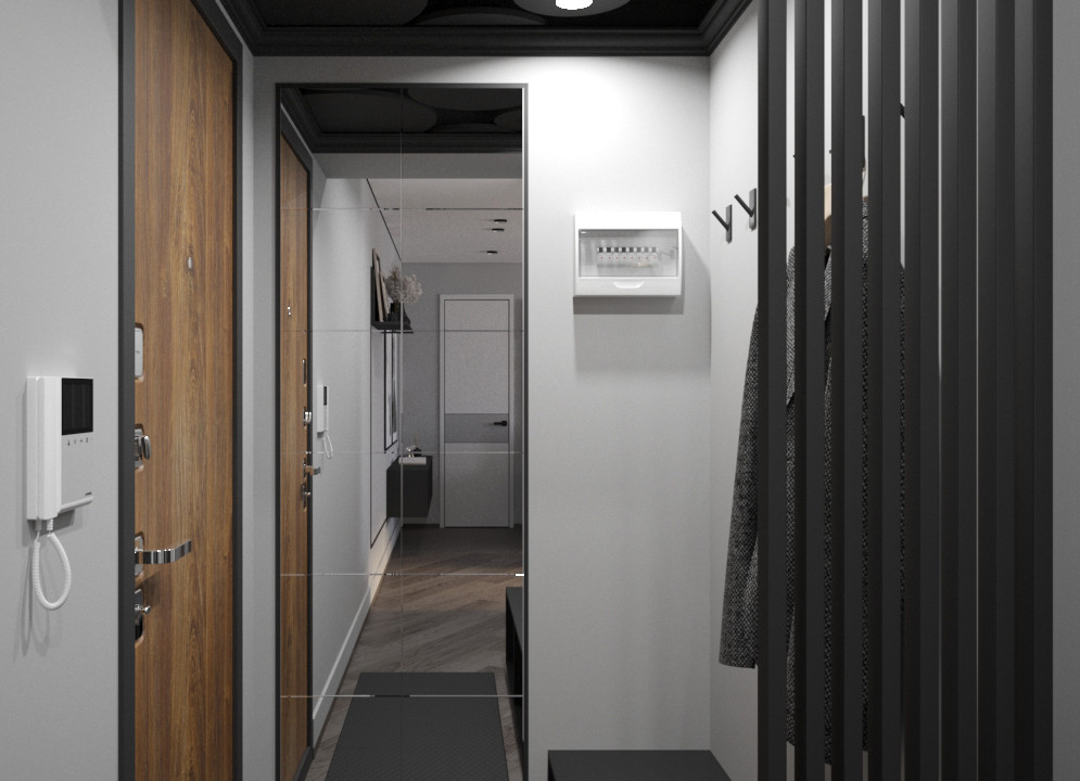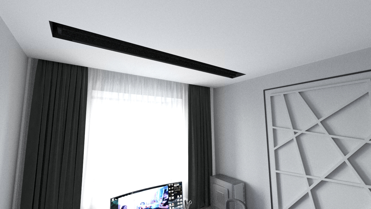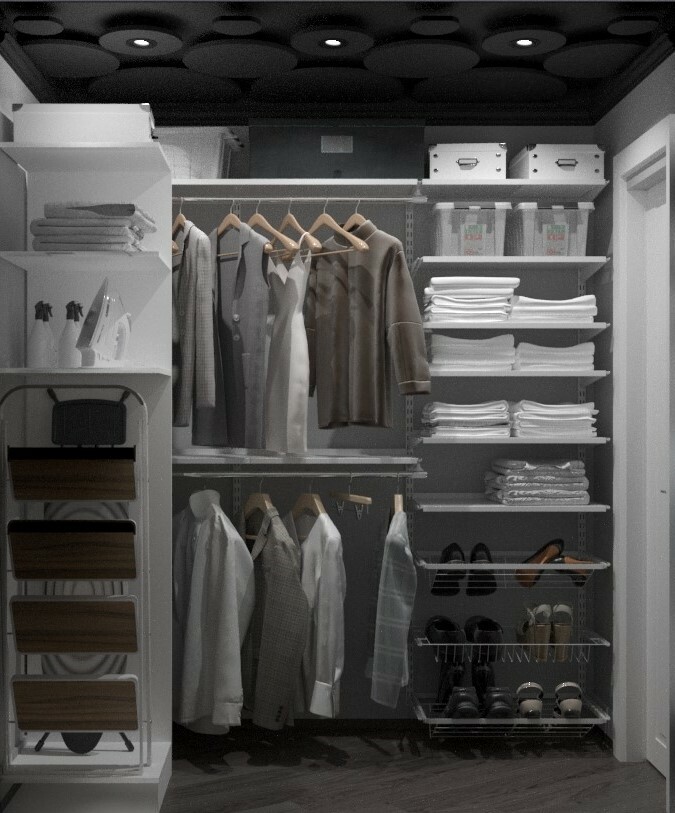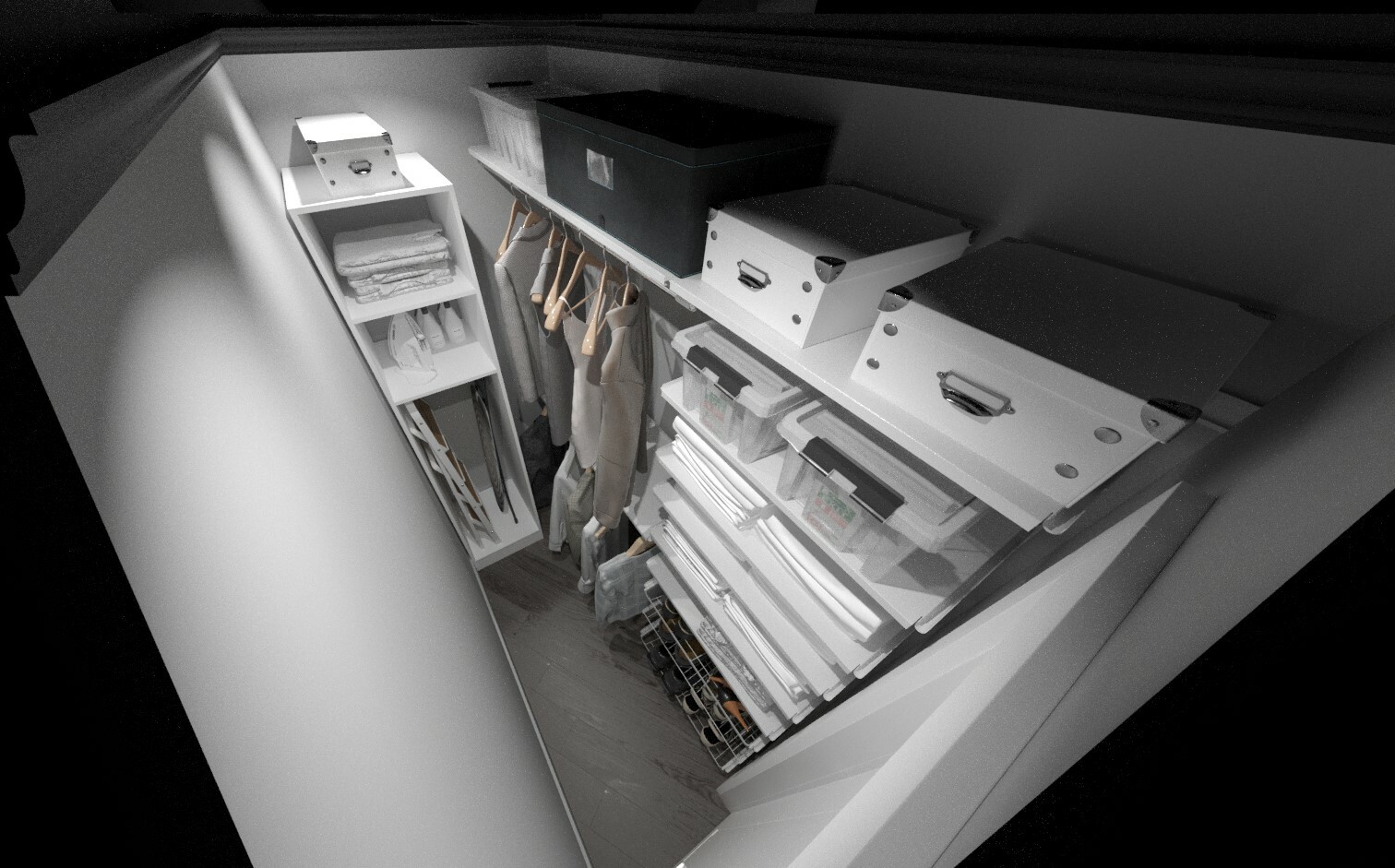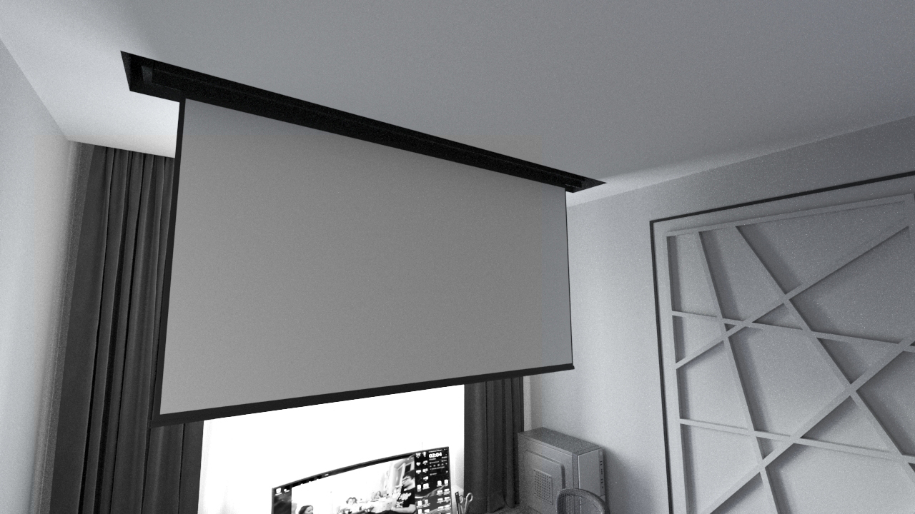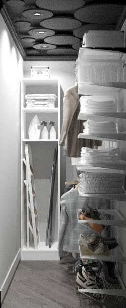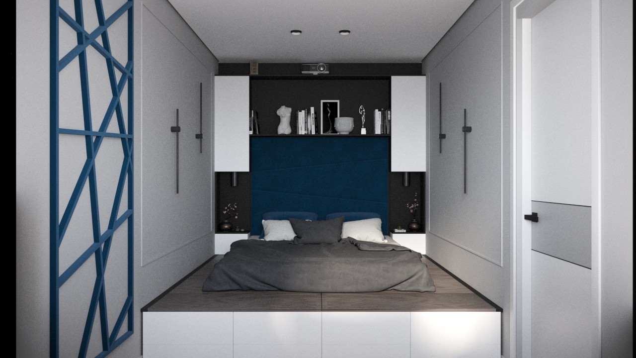 Фишкой комнаты является так же и кинотеатр, который скрывается в кармане потолка. Подиум кровати служит не только вместительным местом для хранения крупногабаритных предметов, но также и столом для лежащего на матрасе и скамьёй для рядового посетителя.