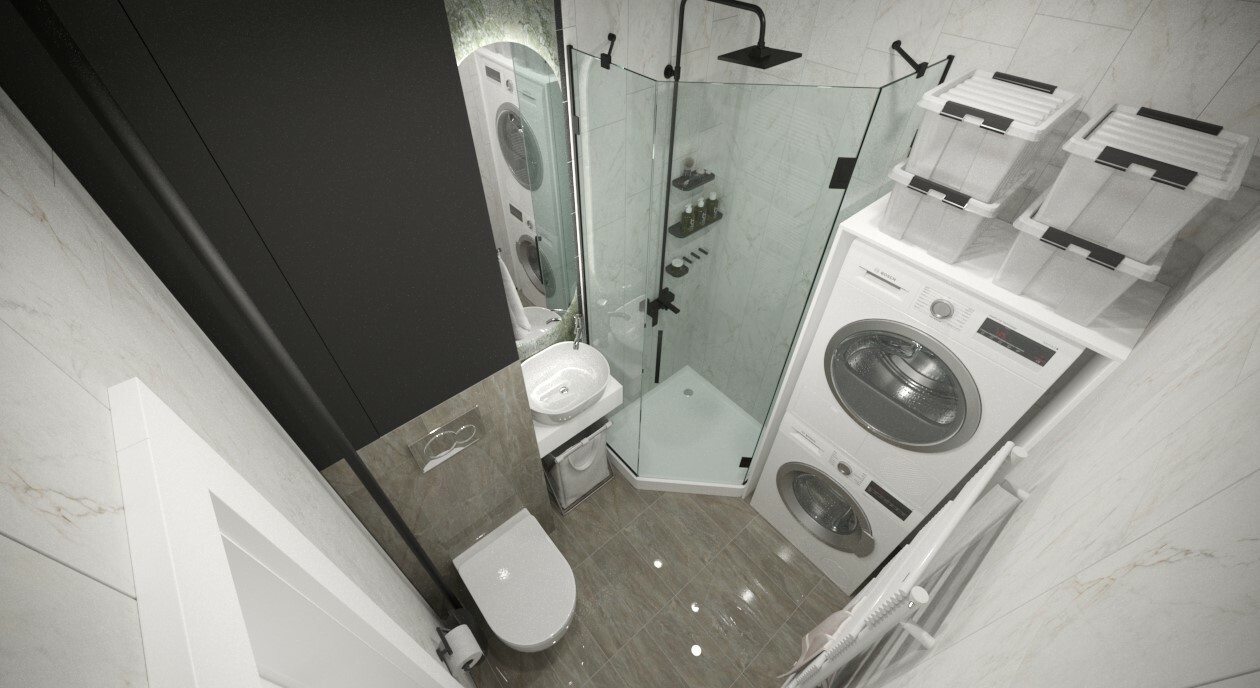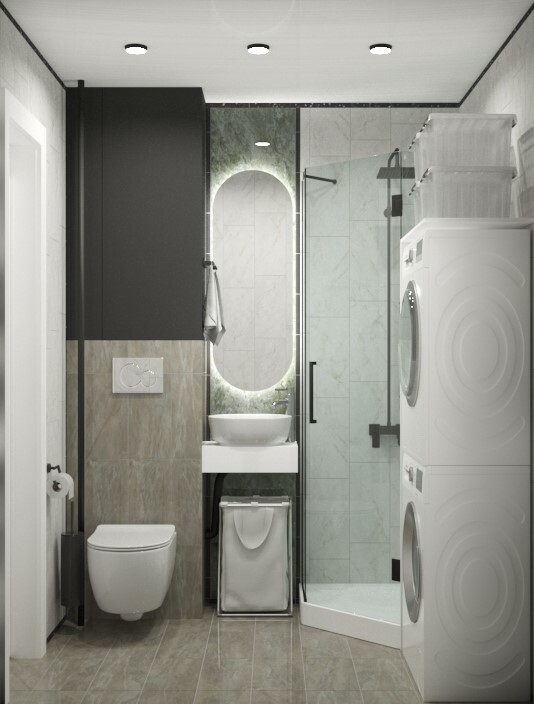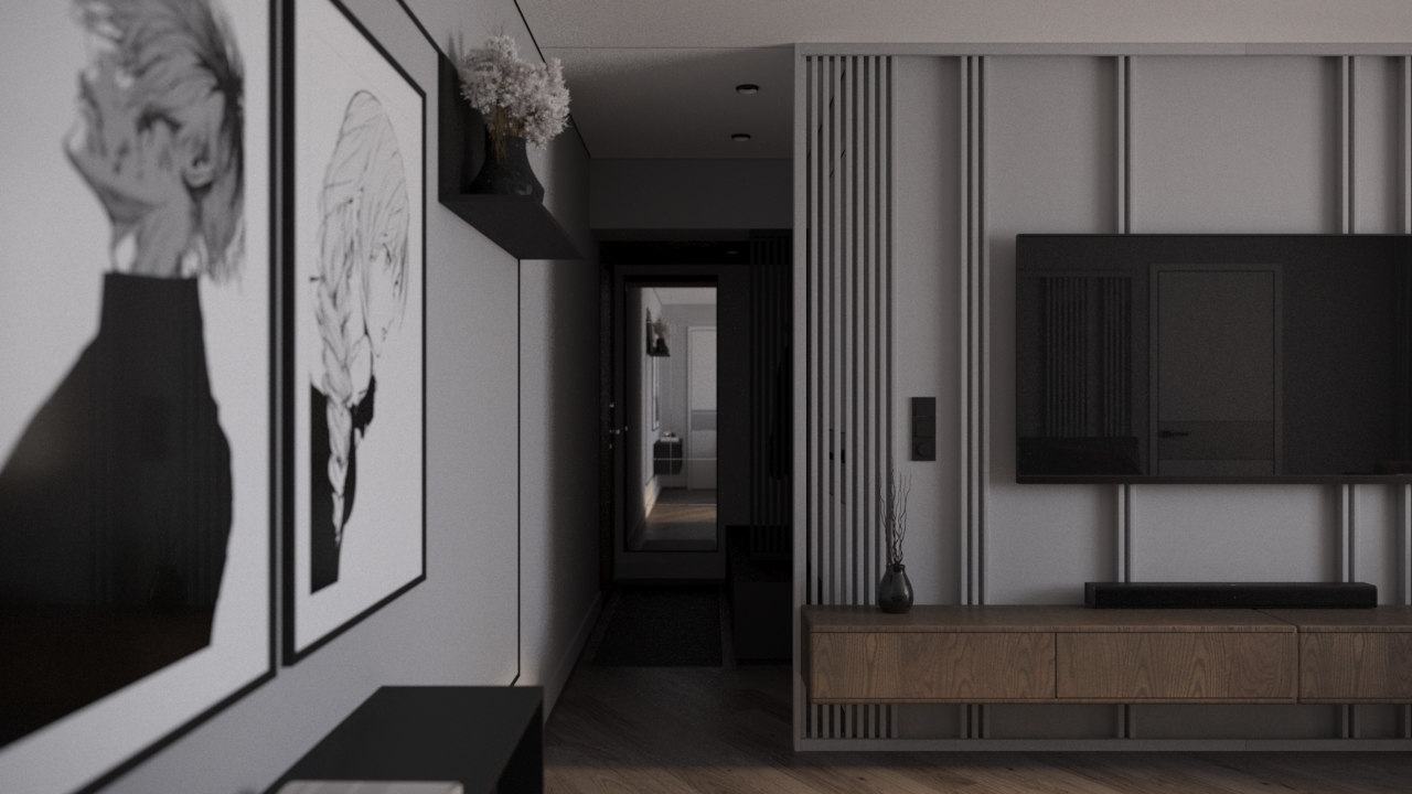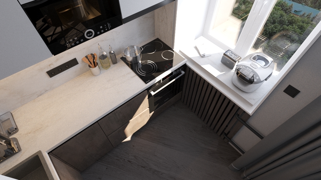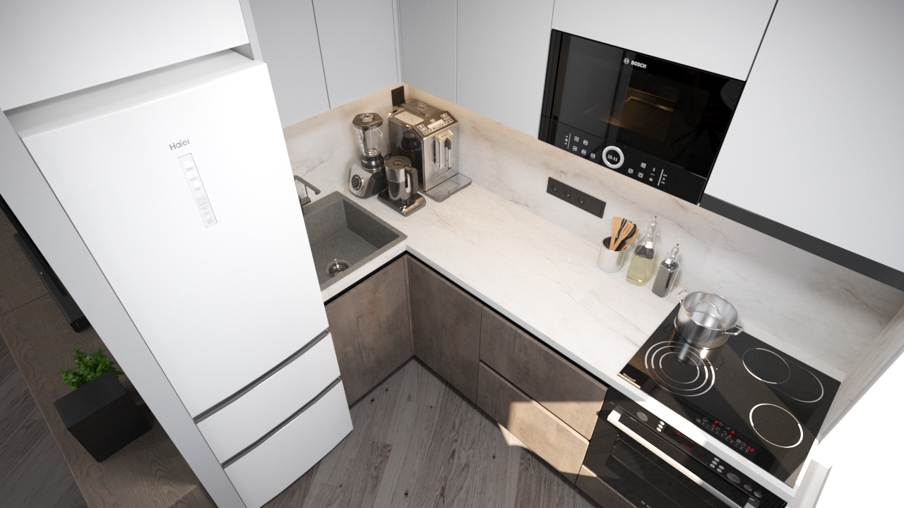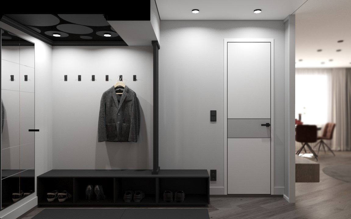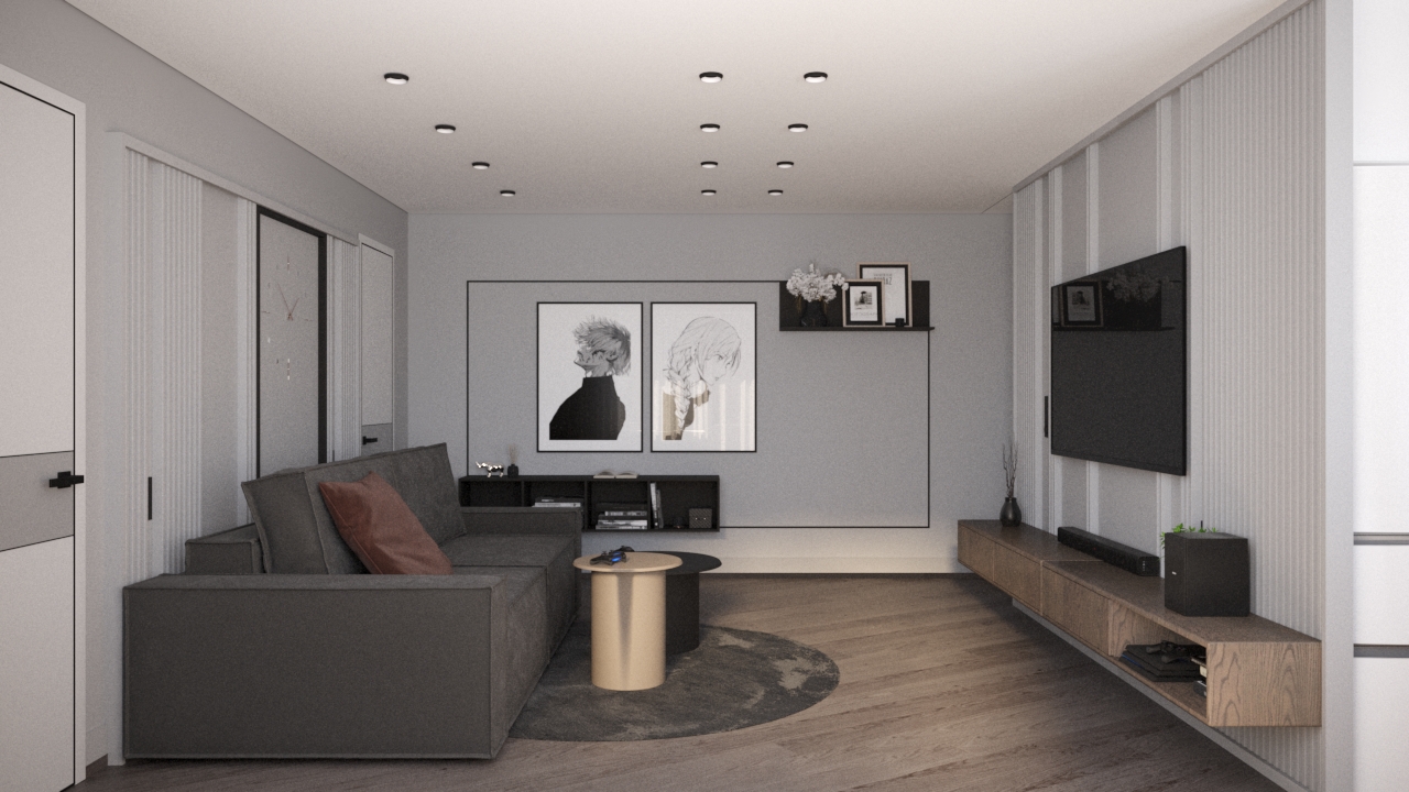 Фишкой комнаты является так же и кинотеатр, который скрывается в кармане потолка. Подиум кровати служит не только вместительным местом для хранения крупногабаритных предметов, но также и столом для лежащего на матрасе и скамьёй для рядового посетителя.